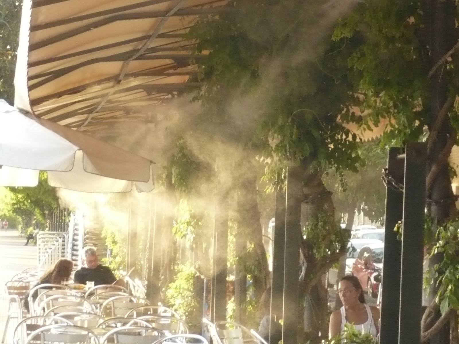 Sevilla como otras ciudades del sur de Europa sufre en verano temperaturas altas y algunos días hasta extremas. Cada vez hay más negocios de restauración en la ciudad que están climatizando sus espacios con pequeños difusores de agua fresca que rebajan la temperatura en algunos grados con respecto al resto de calles y plazas.